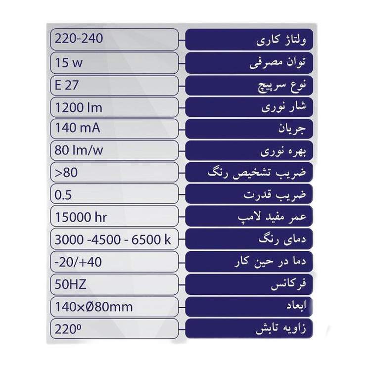 ولتاژ کاری 240-220،توان مصرفی 15 وات،نوع سرپیچ E27،شار نوری 1200 لومن،جریان 140 میلی آمپر،بهره نوری 80 لومن بر وات،ضریب تشخیص رنگ 80