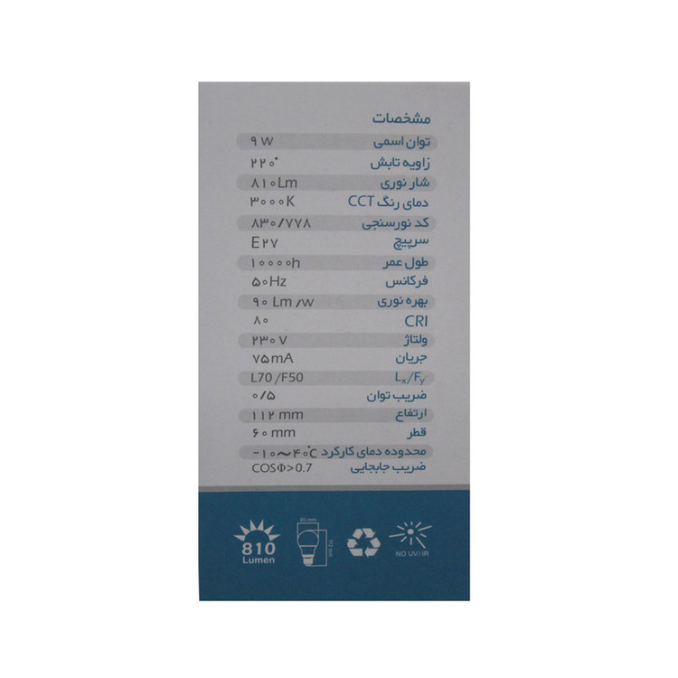 ظاهر لامپ حبابی با توان 9 وات و میزان روشنایی 810 لومن می باشد ولتاژ این لامپ 230 ولت و ابعاد 11x6x6 سانتیمتر با وزن 10 گرم با پایه E27 می باشد طول عمر این لامپ 10000 ساعت و دارای جنس محافظ پلاستیکی و همچنین زاویه نوردهی 220 درجه با رده انرژی+A با فرکانس عملکرد 50 هرتزمی باشد.