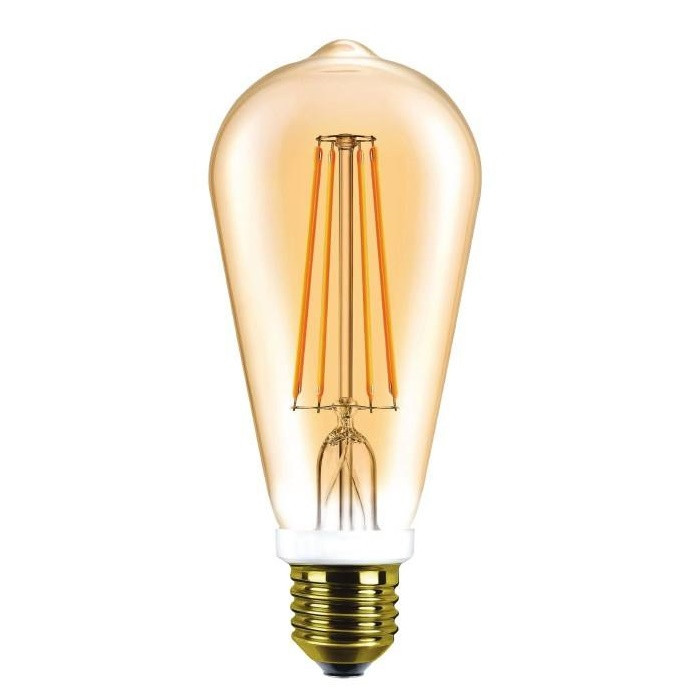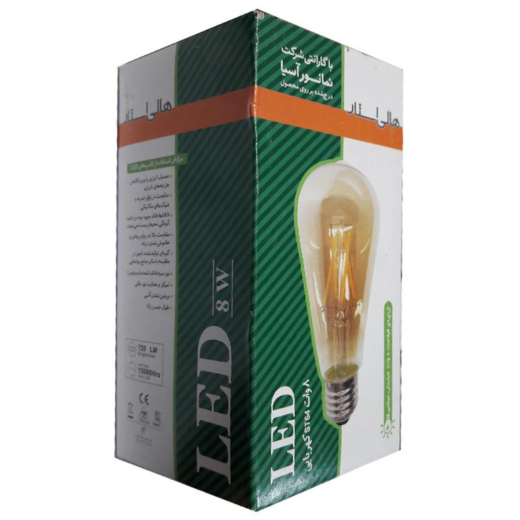 لامپ ادیسونی فیلامنت 8 وات هالی استار مدل ST64 از انواع لامپ های دکوراتیو هالی استار است که توانی برابر با 8 وات دارد و دارای سرپیچ E27 است .شکل ظاهری این لامپ به گونه ای است که کاربرد دکوراتیو دارد و می تواند در محیط های مختلف مورد استفاده قرار گیرد و ضمن تامین نور محیط می تواند در تزئین و نورپردازی فضا نیز تاثیرگذار باشد. این لامپ به دلیل داشتن حباب شفاف شکل ظاهری زیبایی دارد و می تواند در رستوران ها ، کافی شاپ ها ، فروشگاه ها ، مراکز خرید و غیره مورد استفاده قرار گیرد.در تصاویر نورپردازی یا طراحی دکوراسیون موجود در اینترنت یا در کافی شاپ ها و رستوران ها نمونه ای از لامپ های دکوراتیو را دیده اید و متوجه تاثیر بسیار زیاد این محصول و نوردهی ویژه آن با توجه به شار نوری 300 لومنی شده اید که باعث میشود نور آن چشم را آزار ندهد که بدین سبب شما میتوانید تنگستن های این محصول را ببینید. این محصول را میتوانید با انواع مبلمان ، تم های رنگی ، دکوراسیون و ست های کلاسیک و مدرن استفاده کنید و از اتمسفر گرم و مثبتی که ایجاد میکند بهره مند شوید.